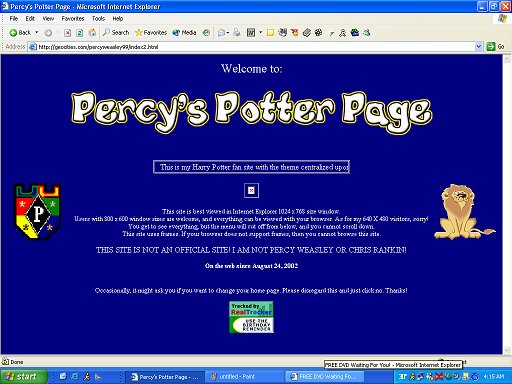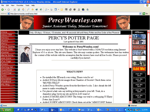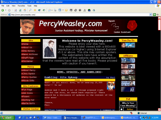 Gah. Where do I begin?! PercyWeasley.com opened on August 24th, 2002. At the time, it was known as "Percy's Potter Page," because it was a look at Harry in Percy's point of view.